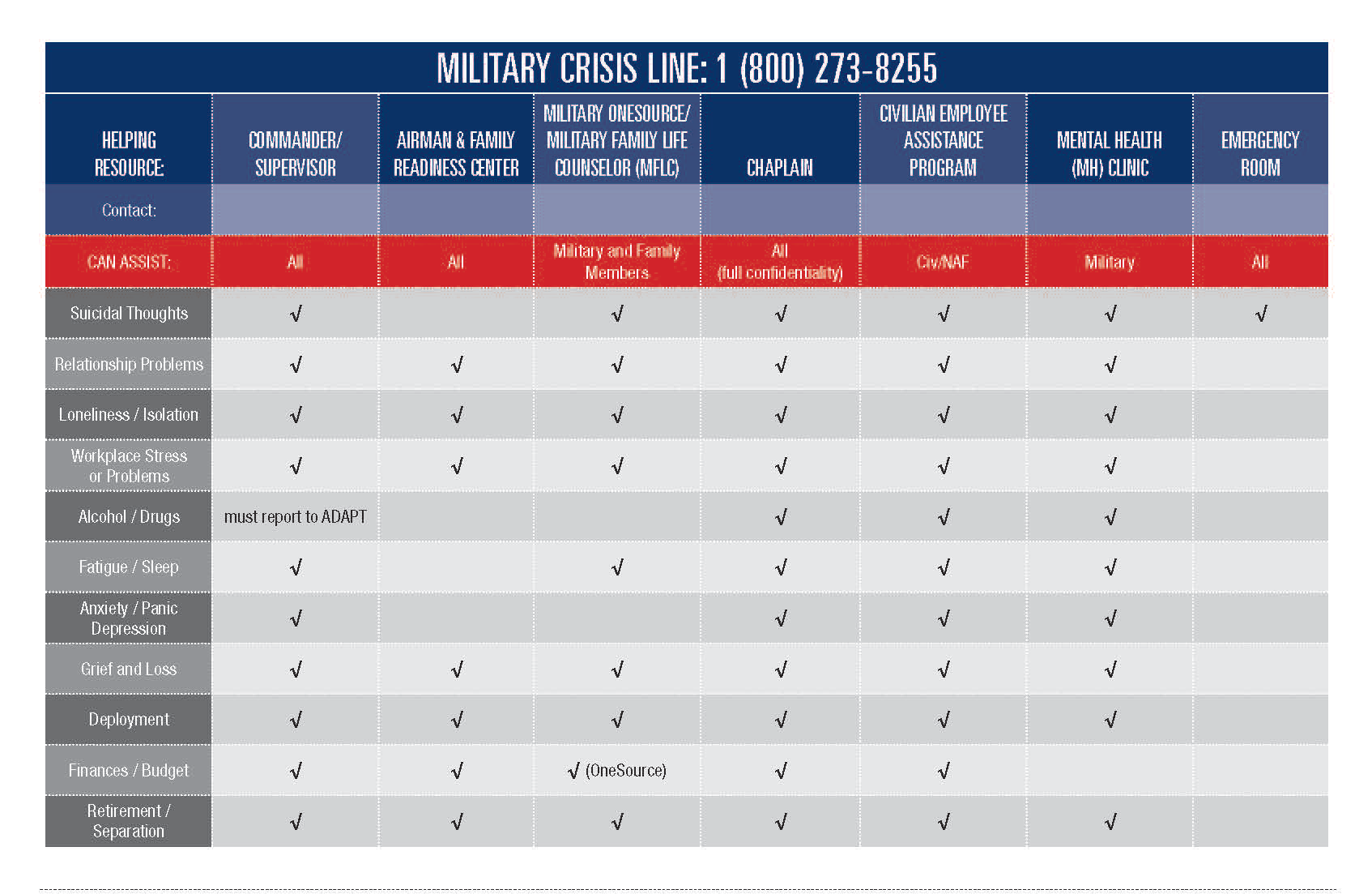 Provides psychological health information and connects service members/families with resources. 1-866-966-1020